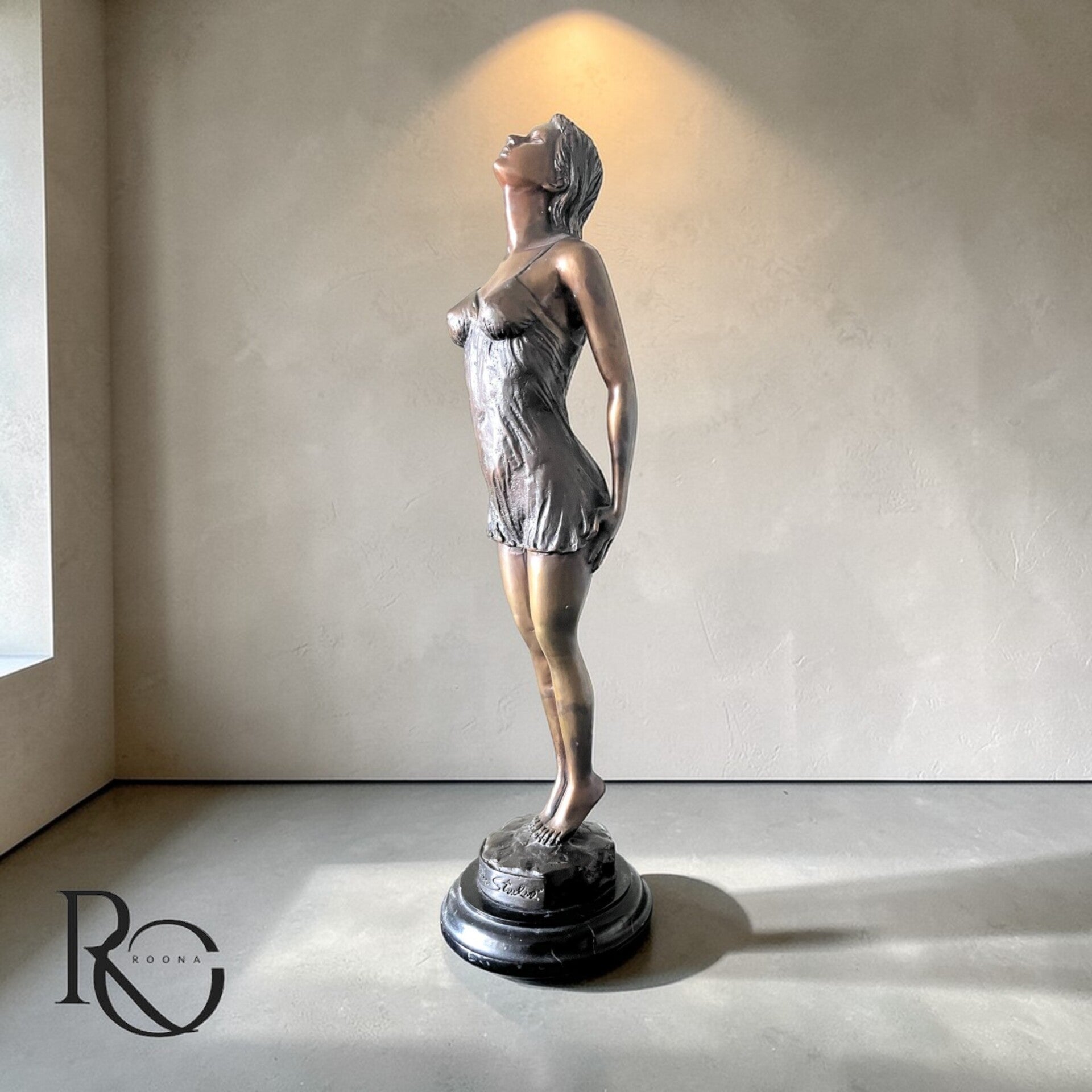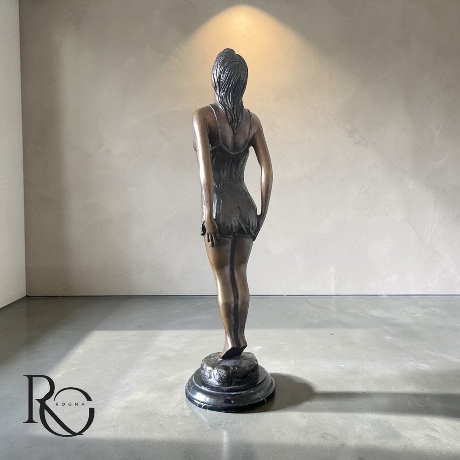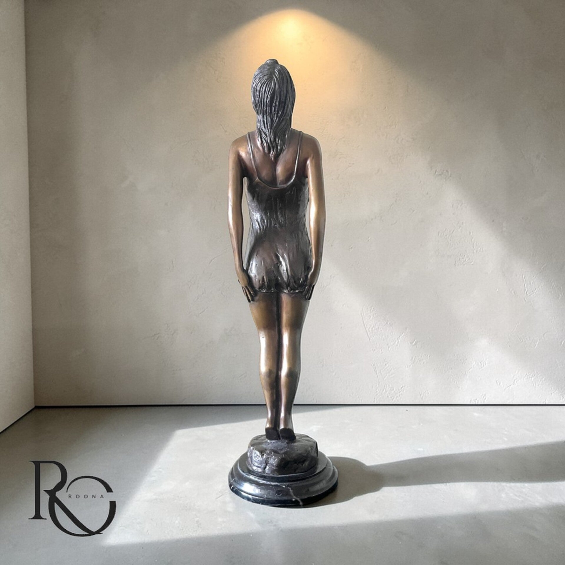 De verfijnde detaillering in het haar, de subtiele plooien van de zwemjurk en de warme patina geven het beeld een zachte, bijna levende uitstraling. Het silhouet is krachtig maar ingetogen — klassiek, vrouwelijk en evenwichtig.
