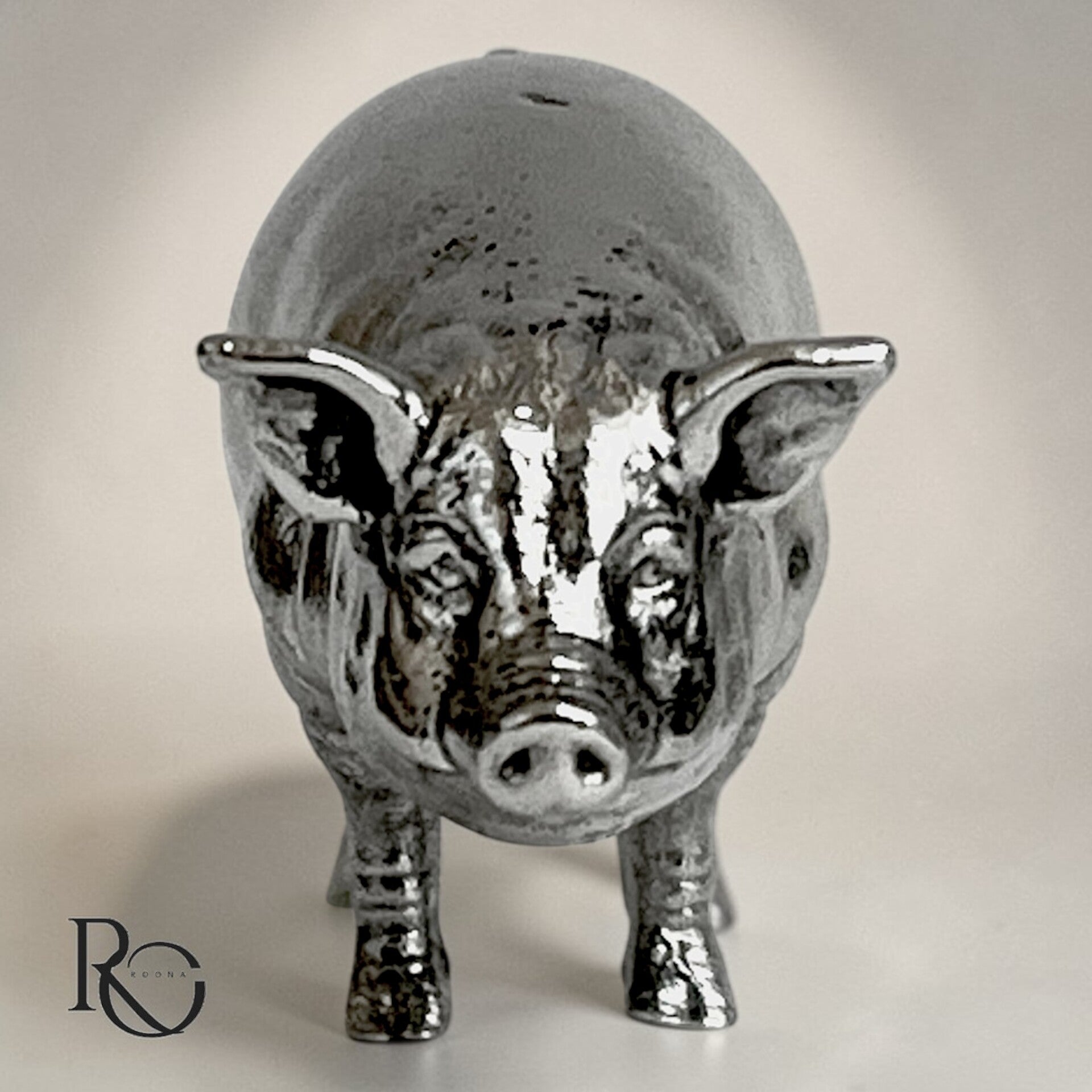 Deze handgegoten zilveren miniatuur van een staand varken is een opvallend en charmant object, met een robuuste vorm en een levendige uitstraling.