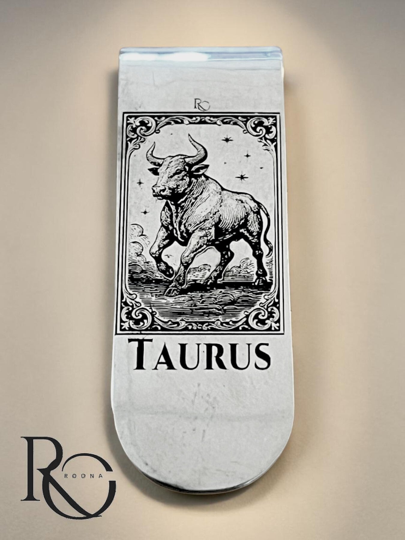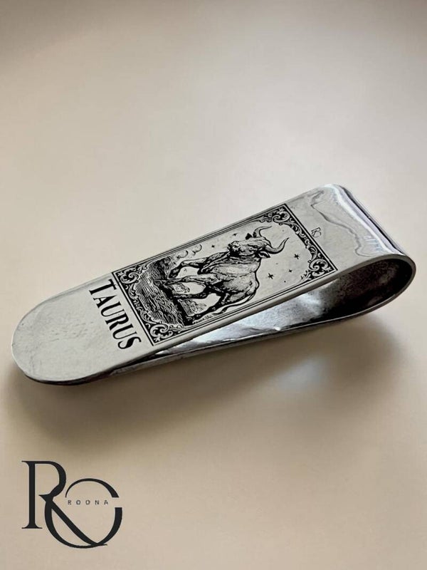 Deze zilveren geldclip is handgevormd uit massief 925 sterling zilver en voorzien van een gedetailleerde Taurus gravure in klassieke, 17e-eeuwse stijl.